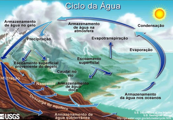 aquíferos e 0,001% na atmosfera como vapor, nuvens (formadas