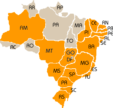 Piauí Rio Grande do Sul Santa Catarina Paraná São Paulo Rio de Janeiro Espírito Santo Mato Grosso do Sul Sergipe Alagoas Ceará Bahia Paraíba Pernambuco Rio Grande do Norte Amazonas Mato Grosso Goiás Distrito Federal